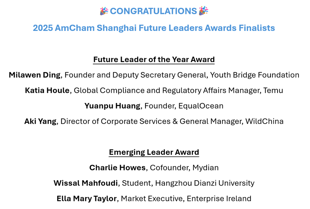 AmCham Shanghai's Future Leaders Committee invites you to the 2025 AmCham Shanghai Future Leaders Awards Ceremony on December 2 from 6:30 PM - 8:30 PM at the AmCham Shanghai Conference Center.